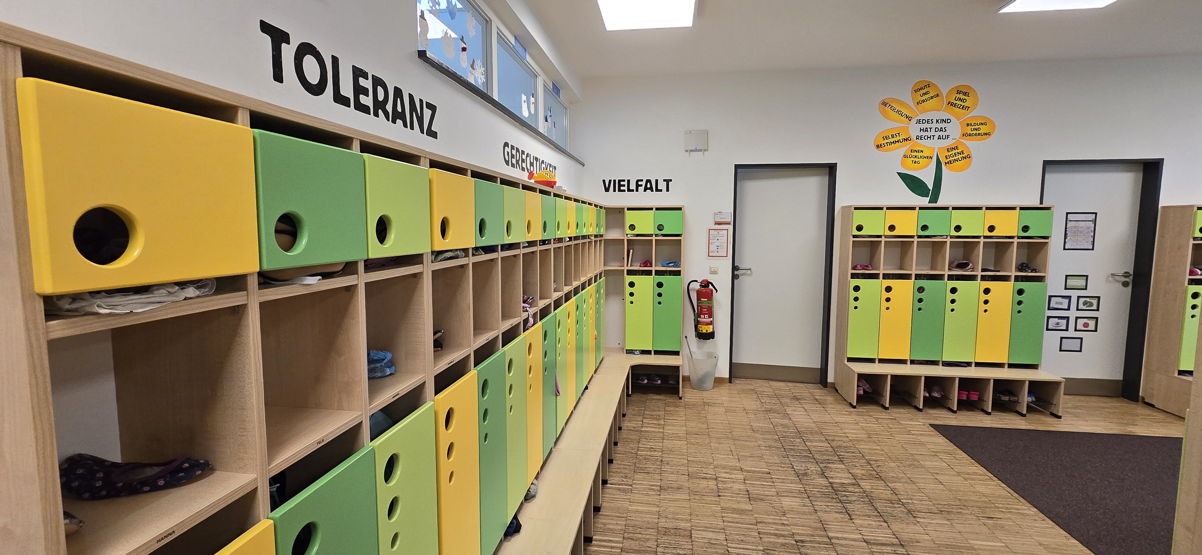 Garderobe Die Kinder kommen jeden Morgen in der Garderobe an. Hier hat jedes Kind seinen eigenenPlatz für Kleidung und persönliche Gegenstände. |